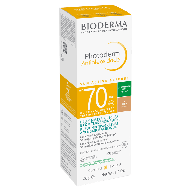 O Protetor Solar Gel-Creme Antioleosidade Cor Médio FPS 70 Suave Bioderma Photoderm é um protetor solar em gel-creme com cor, indicado para peles mistas, oleosas e com tendência à acne. Possui alta proteção solar FPS 70, textura ultraleve, toque seco e acabamento matte invisível, oferecendo controle da oleosidade e uniformização do tom da pele.