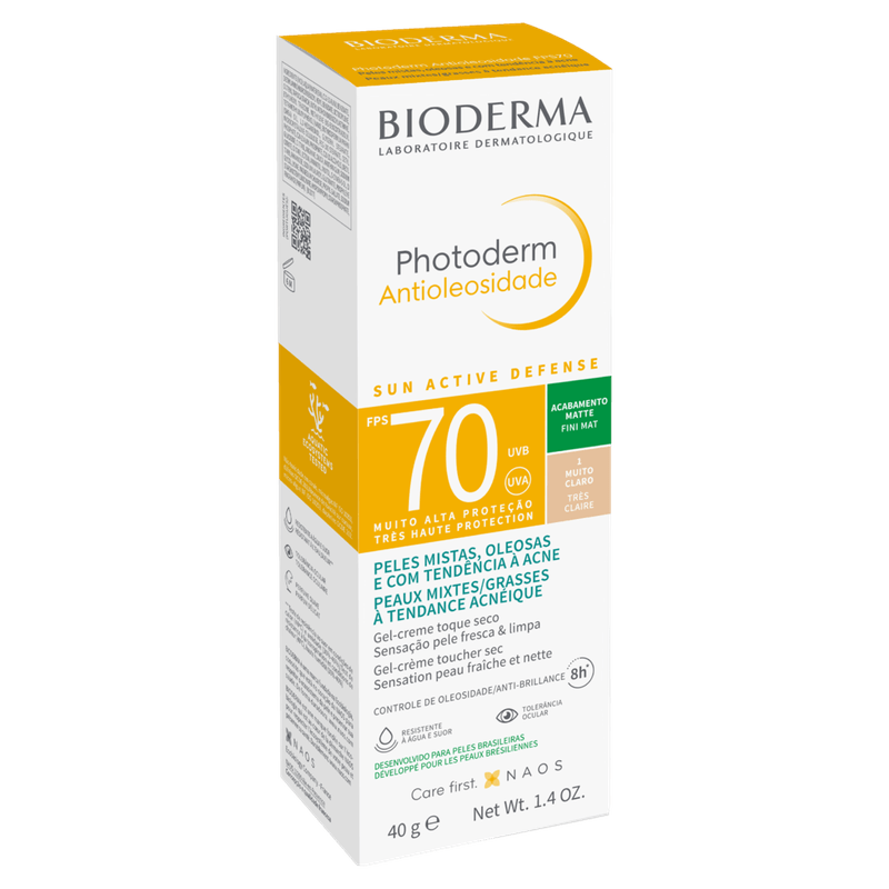 O Protetor Solar Gel-Creme Antioleosidade Cor Muito Claro FPS 70 Bioderma Photoderm é um protetor solar em gel-creme indicado para peles mistas a oleosas, com alta proteção solar FPS 70, textura ultrasseca, toque seco e acabamento matte invisível, ideal para controle da oleosidade e prevenção da acne.