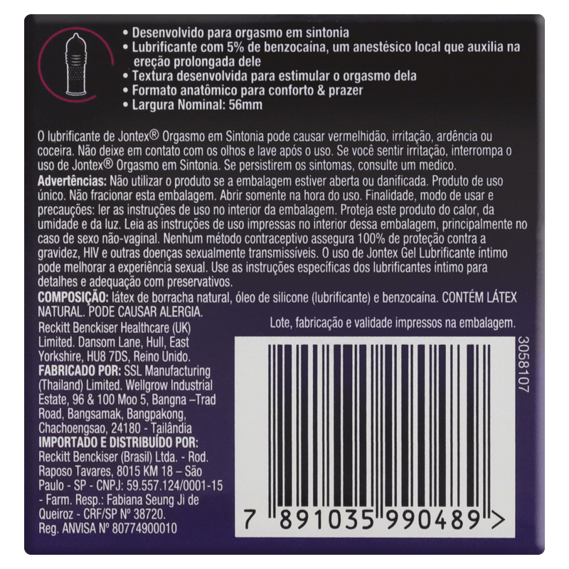 Advertência: O lubrificante de Jontex Orgasmo em Sintonia pode causar vermelhidão, irritação, ardência ou coceira. Não deixe em contato com os olhos e lave após o uso. Se você sentir irritação, interrompa o uso de Jontex Orgasmo em Sintonia. Se persistirem os sintomas, procure um médico. Pode causar alergia. Não utilizar o produto se a embalagem estiver aberta ou danificada. Produto de uso único. Não fracionar esta embalagem. Abrir somente na hora do uso.