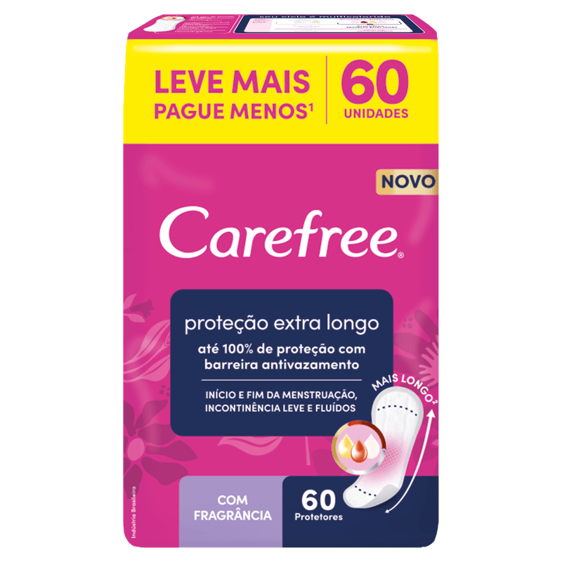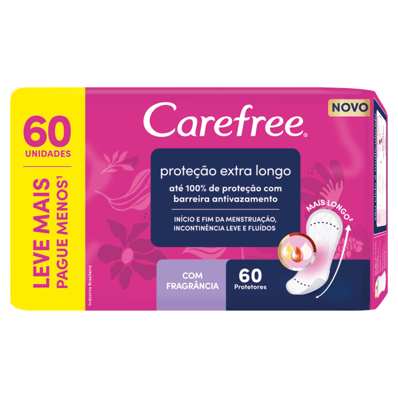 CAREFREE® Proteção Extra Longo é o protetor diário ideal para o início e o fim da menstruação, fluxos leves e casos de incontinência urinária leve. Sua barreira antivazamento garante até 100% de proteção e controle de odores, mantendo a região íntima seca e confortável ao longo do dia.
