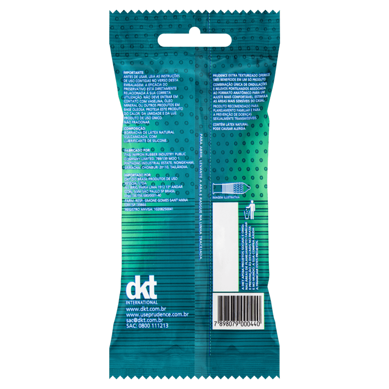 Advertência: Pode causar alergia. A eficácia do preservativo está diretamente relacionada à sua correta utilização. Não deve entrar em contato com vaselina, óleo mineral ou outros produtos em base oleosa. Produto de uso único. Não fracionar. Alertamos que nenhum método contraceptivo e de prevenção às DSTs é totalmente seguro e desprovido de riscos, e que nenhum preservativo pode garantir 100% de eficácia. Jamais reutilize um preservativo. Não use mais de um preservativo ao mesmo tempo, pois o atrito entre eles durante a relação sexual pode causar rompimentos. Não use o preservativo com produtos em base oleosa, vaselina, óleo mineral e outros derivados de petróleo. Estes são incompatíveis com o látex e podem danificá-lo facilitando a ruptura do preservativo. Nos casos em que medicamentos de aplicação no pênis ou na vagina tenham sido utilizados, consulte seu médico ou farmacêutico sobre a compatibilidade destes com os preservativos de látex. O uso não vaginal de preservativos pode aumentar os riscos de os mesmos deslizarem ou serem danificados. Produtos que contém látex, como este preservativo masculino, podem causar reações alérgicas em alguns usuários. Caso ocorra irritação em qualquer um dos parceiros, o uso deverá ser descontinuado. Persistindo os sintomas, consulte seu médico. Observando qualquer alteração no preservativo (embalagem, cor, aroma, textura, espessura, formato, lubrificante, etc.), não o utilize.