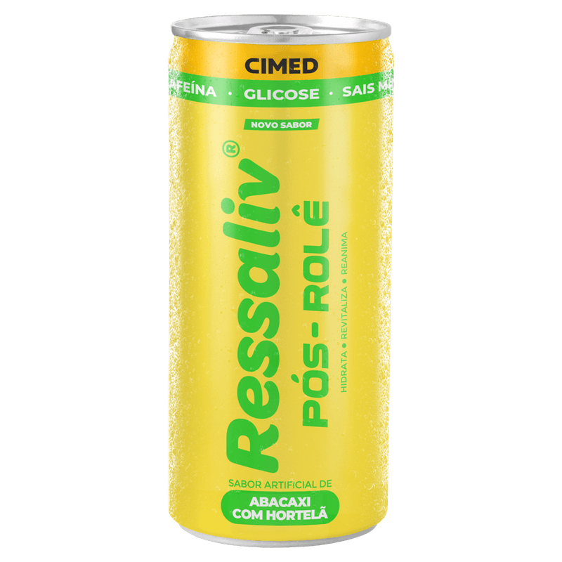 Com apresentação em lata de 269 ml, textura líquida e sabor abacaxi com hortelã, o Ressaliv Pós-Rolê atua na recuperação física e energética, especialmente após esforços intensos. Livre de glúten, é destinado exclusivamente ao público adulto, sem necessidade de prescrição médica, e deve ser consumido por via oral.