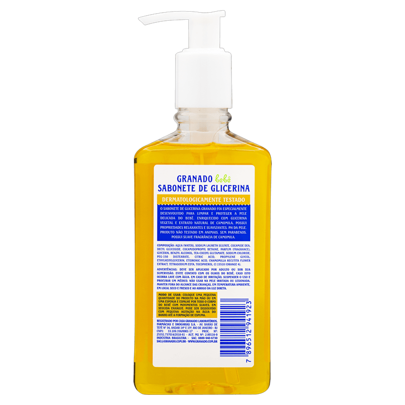 O Sabonete Líquido Bebê Camomila Granado é apresentado em frasco de 250ml com válvula pump, indicado para a higiene delicada da pele de bebês e crianças. Sua fórmula suave, enriquecida com glicerina vegetal e extrato natural de camomila, promove limpeza e hidratação, cuidando da pele sensível durante o banho.