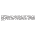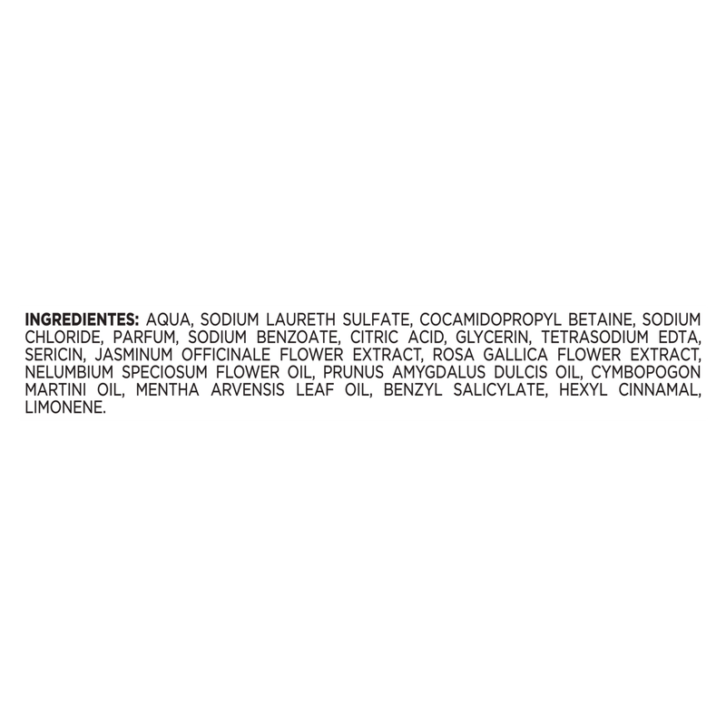 Aqua, sodium laureth sulfate, cocamidopropyl betaine, sodium chloride, parfum, sodium benzoate, citric acid, glycerin, tetrasodium EDTA, sericin, jasminum officinale flower extract, rosa gallica flower extract, nelumbium speciosum flower oil, prunus amygdalus dulcis oil, cymbopogon martini oil, mentha arvensis leaf oil, benzyl salicylate, hexyl cinnamal, limonene.