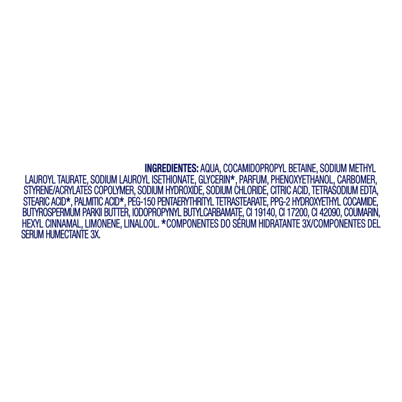Composição: Aqua, cocamidopropyl betaine, sodium methyl lauroyl taurate, sodium lauroyl isethionate, glycerin*, parfum, phenoxyethanol, carbomer, styrene/acrylates copolymer, sodium hydroxide, sodium chloride, citric acid, tetrasodium EDTA, stearic acid*, palmitic acid*, PEG-150 pentaerythrityl tetrastearate, PPG-2 hydroxyethyl cocamide, butyrospermum parkii butter, iodopropynyl butylcarbamate, CI 19140, CI 17200, CI 42090, coumarin, hexyl cinnamal, limonene, linalool. * Componentes do sérum hidratante 3x.