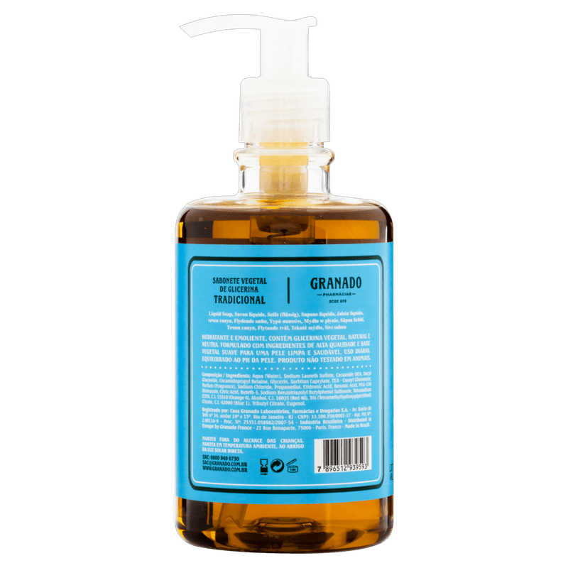 O Sabonete Líquido Glicerina Tradicional Granado é um sabonete líquido de 300 ml indicado para a limpeza diária de todos os tipos de pele, proporcionando uma higienização suave e eficaz.