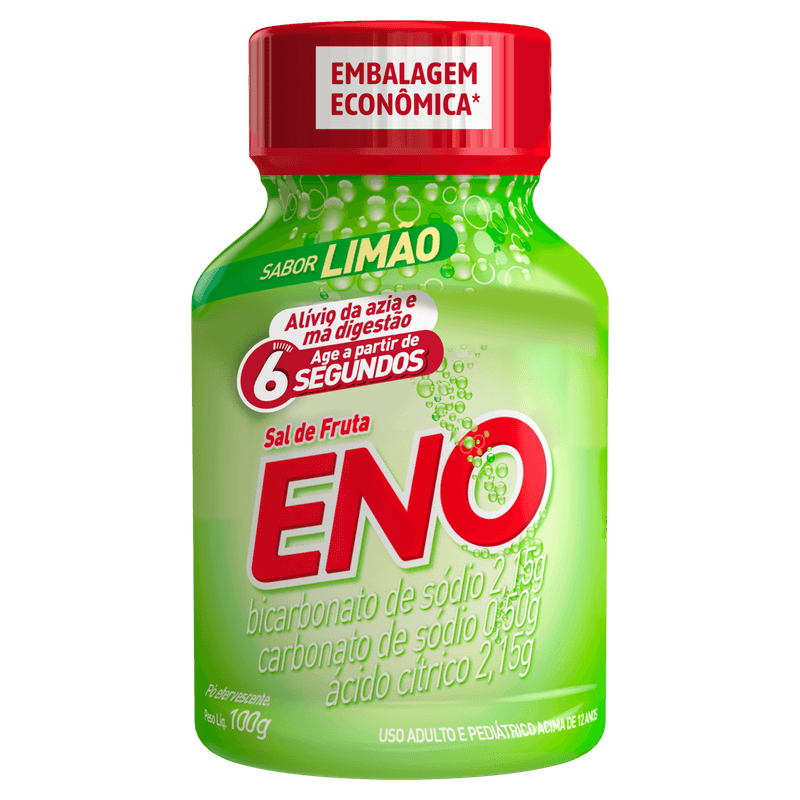 O Sal de Fruta Limão Eno atua neutralizando o excesso de ácido no estômago, aliviando desconfortos como azia e indigestão ácida. Apresenta textura em pó efervescente, que ao ser dissolvido em água gera uma bebida refrescante com sabor limão. Comercializado em embalagem prática de 100g, é um produto de venda livre, sem necessidade de receita médica. Este medicamento não deve ser utilizado por pessoas com hipersensibilidade a qualquer componente da fórmula. Em caso de dúvidas, consulte o seu médico ou farmacêutico. Mantenha fora do alcance das crianças.