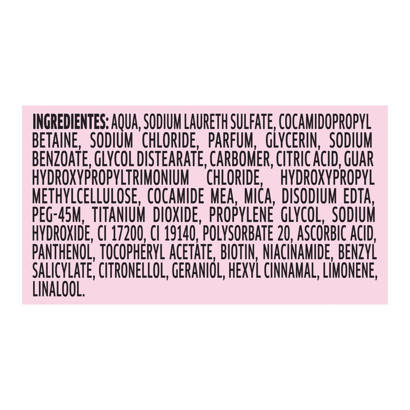 Aqua, sodium laureth sulfate, cocamidopropyl betaine, sodium chloride, parfum, glycerin, sodium benzoate, glycol distearate, carbomer, citric acid, guar hydroxypropyltrimonium chloride, hydroxypropyl methylcellulose, cocamide MEA, mica, disodium EDTA PEG-45M, titanium dioxide, propylene glycol, sodium hydroxide, CI 17200, CI 19140, polysorbate 20, ascorbic acid, panthenol, tocopheryl acetate, biotin, niacinamide, benzyl salicylate, citronellol, geraniol, hexyl cinnamal, limonene, linalool.