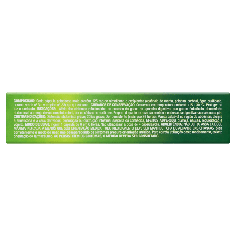 Este medicamento apresenta ação rápida no alívio do desconforto causado por gases, atuando especificamente no aparelho digestivo. Sua fórmula contém simeticona e excipientes como amido, gelatina e corantes, em cápsulas gelatinosas moles, sem sabor, facilitando a ingestão. A embalagem contém 10 cápsulas, sem necessidade de retenção de receita, e é indicada para uso oral em adultos e crianças acima de 12 anos, sob supervisão médica. Registro MS 1234567890. Este medicamento não deve ser utilizado por pessoas com hipersensibilidade a qualquer componente da fórmula. Mantenha fora do alcance das crianças. Siga a posologia recomendada e consulte um médico em caso de dúvidas ou sintomas persistentes.