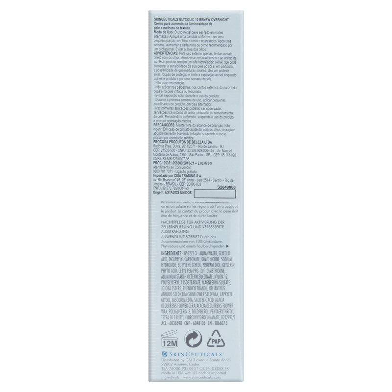 Modo de usar: Aplicar à noite sobre a pele limpa, inicialmente em dias alternados, evitando a área dos olhos. Conforme a tolerância, aumentar para uso diário. Durante o dia, usar protetor solar para proteger a pele sensibilizada pelo ácido glicólico.