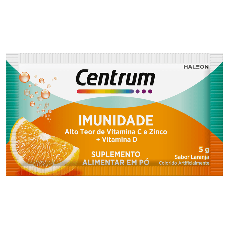 Centrum Imunidade atua diretamente no fortalecimento do sistema imunológico, contribuindo para a proteção contra agentes externos e para o equilíbrio do organismo. Sua composição inclui carbonato de magnésio, ácido ascórbico (vitamina C), óxido de zinco, colecalciferol (vitamina D), além de ingredientes que garantem sabor e efervescência, como aroma de laranja e corante amarelo crepúsculo. O produto é livre de prescrição médica, possui registro MS 23876 e é apresentado em embalagem com 1 envelope de 5g, ideal para uso diário.